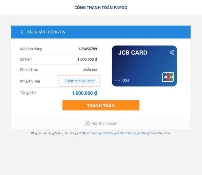 [2] Quý khách nhập thông tin thẻ JCB, Quý khách cần kiểm tra: Ưu đãi đã áp dụng & số tiền còn lại cần thanh toán sau khi đã áp dụng ưu đãi, trước khi xác nhận thanh toán.