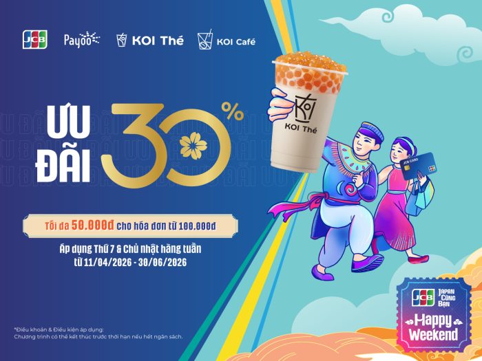 Thưởng thức trà sữa yêu thích, nhận ngay ưu đãi hấp dẫn mỗi dịp cuối tuần! Khi thanh toán bằng thẻ JCB tại KOI Thé, khách hàng được giảm ngay 30% tối đa 50.000đ cho đơn hàng từ 100.000đ, giúp bạn vừa tận hưởng đồ uống ngon, vừa tối ưu chi tiêu hiệu quả.