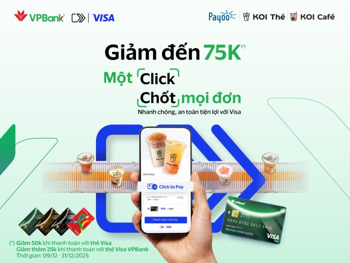 Xuất phát từ sự quan tâm và ủng hộ của khách hàng đối với chương trình khuyến mại vào tháng 10, tổ chức thẻ Visa, VP Bank, KOI Thé và Payoo quyết định mang ưu đãi quay trở lại trong tháng 12 này. Với thao tác thanh toán bằng Click to Pay với thẻ Visa khi mua hàng trên ứng dụng KOI Thé, khách hàng sẽ được giảm giá trực tiếp trên hóa đơn. Đặc biệt mức giảm sẽ hấp dẫn hơn nữa, lên đến 75.000đ cho mỗi hóa đơn 150.000đ nếu khách hàng dùng thẻ Visa VPBank.