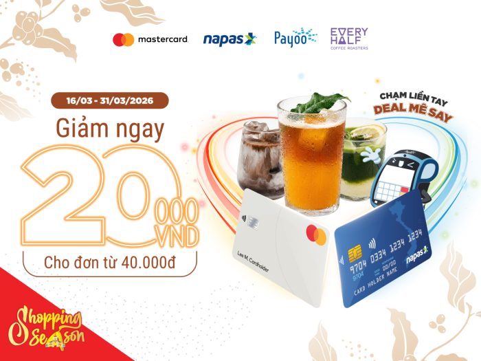 Khách hàng sẽ được giảm ngay 20.000đ cho đơn hàng từ 40.000đ khi chạm để thanh toán bằng thẻ Contactless Mastercard® hoặc Napas trên Payoo POS tại các cửa hàng Every Half Coffee. Chương trình áp dụng từ ngày 16/03/2026 đến hết ngày 31/03/2026, hoặc đến khi hết số lượng ưu đãi.