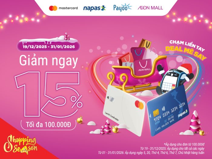 Giáng sinh gõ cửa, Tết cũng đang đến rất gần, nhu cầu mua sắm quà tặng, vật dụng trang trí và sinh hoạt gia đình nhiều hơn. Trong giai đoạn cao điểm này, việc chi tiêu thông minh trở thành ưu tiên của nhiều người tiêu dùng, đặc biệt khi mua sắm tại các trung tâm thương mại. Bắt nhịp với nhu cầu thị trường thời gian này, Mastercard, Napas, Payoo và AEON MALL phối hợp triển khai chương trình ưu đãi giảm 15%, tối đa 100.000đ nhằm mang đến trải nghiệm mua sắm thuận tiện cho khách hàng.