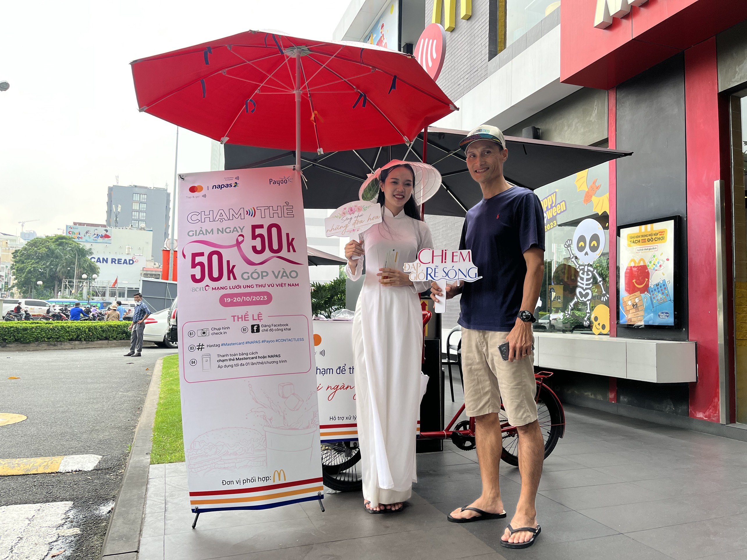 Trong 2 ngày diễn ra chương trình,khách hàng được nhận ưu đãi đồng giá 50.000đ khi mua bó hoa tươi hoặc combo thức ăn và nước uống McDonald’s (trị giá từ 100.000đ) khi thanh toán bằng phương thức chạm thẻ NAPAS hoặc Mastercard. Toàn bộ doanh thu của chương trình được quyên góp cho Mạng lưới Ung thư vú Việt Nam.
