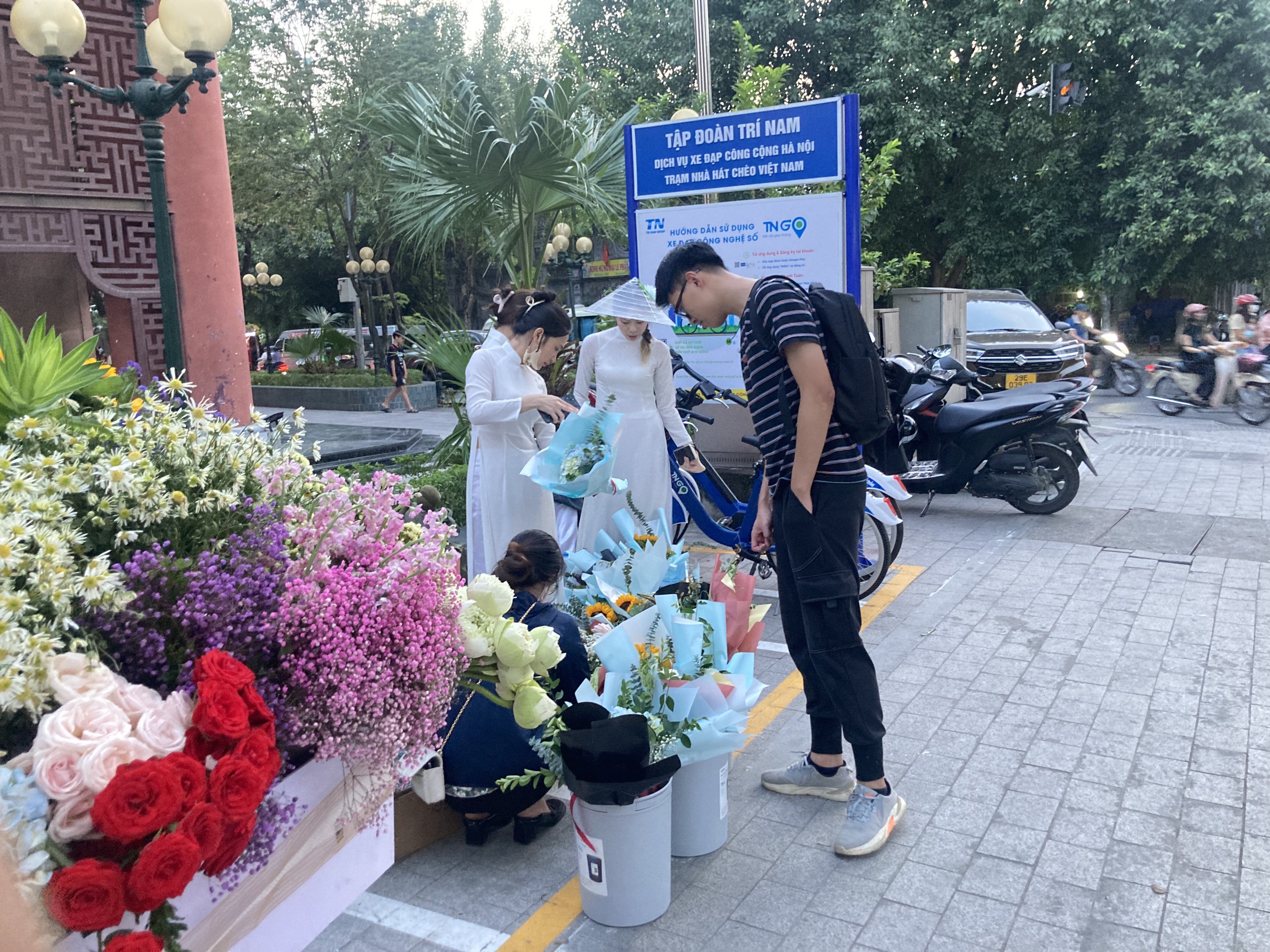 Sáng sớm ngày 20/10, nhiều bạn trẻ tranh thủ đến các xe hoa để mua những bó hồng sớm nhất tặng người thân. Anh Huy Tưởng cho biết, mẹ anh đang nằm viện, biết thông tin có xe hoa, anh chạy ra ngay để mua một bó mang vào viện chúc mừng mẹ ngày 20.10 và mong mẹ mau khỏe. Trước giờ đến lớp, nhiều phụ huynh cũng tranh thủ ghé điểm tổ chức sự kiện để mua hoa cho cô giáo.