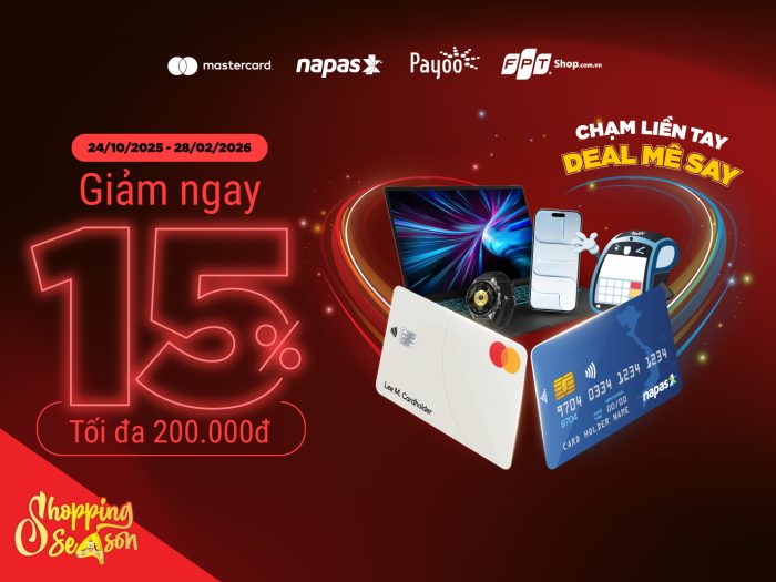Tận hưởng trải nghiệm mua sắm hiện đại, an toàn và tiết kiệm tại hệ thống FPT Shop với ưu đãi giảm ngay 15% tối đa 200.000 đồng cho đơn từ 200.000 đồng. Chỉ áp dụng với hình thức thanh toán bằng thẻ Contactless Mastercard hoặc NAPAS trên thiết bị Payoo POS.