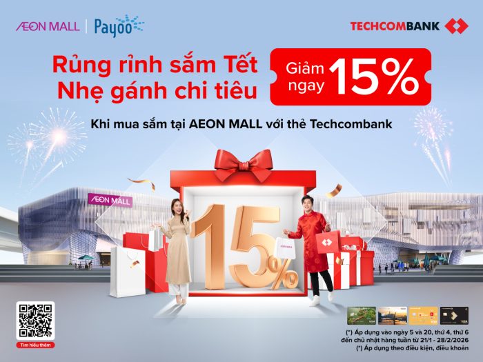 Chủ thẻ Techcombank tưng bừng mua sắm đầu năm với ưu đãi 15% Tại AEON MALL