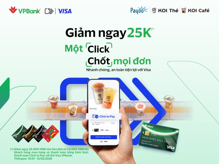 Khách hàng sẽ được giảm ngay 25.000đ cho hóa đơn từ 50.000đ khi thanh toán bằng hình thức Click to Pay với thẻ Visa VPBank trên ứng dụng KOI Thé Vietnam, bắt đầu từ ngày 15/01/2026 đến 15/02/2026.