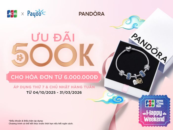Cơ hội để bạn lấp đầy bộ sưu tập phụ kiện của mình tại Pandora vào mỗi cuối tuần. Chỉ cần thanh toán bằng thẻ JCB qua Payoo POS khi mua sắm tại Pandora, bạn sẽ được giảm ngay 500.000 đồng cho đơn hàng từ 6 triệu trở lên.