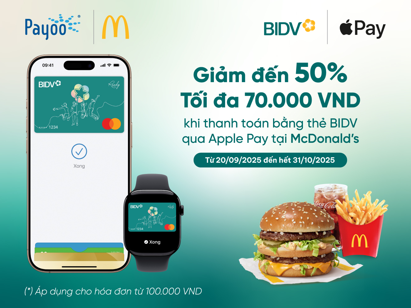 Từ ngày 20/09/2025 đến hết ngày 31/10/2025, khi thưởng thức các bữa ăn tại McDonald’s và thanh toán bằng thẻ BIDV liên kết Apple Pay qua thiết bị Payoo POS, khách hàng sẽ được giảm ngay 50% giá trị đơn hàng, tối đa lên đến 70.000 đồng.