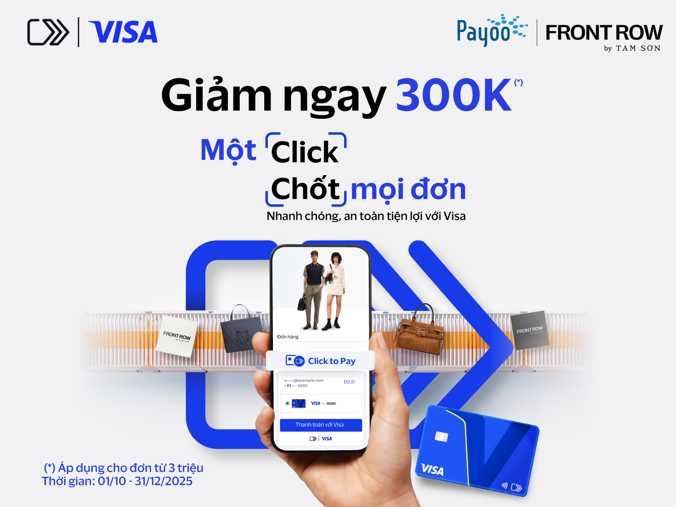 Chỉ với một cú click, khách hàng đã bước vào thế giới hàng hiệu đẳng cấp của Tamson Fashion, nơi hội tụ những thiết kế tinh tế từ các thương hiệu quốc tế danh tiếng, từ bộ vest lịch lãm, váy dạ hội sang trọng cho đến phụ kiện thời thượng. Mỗi lần “chốt đơn” tại nền tảng bán lẻ Front Row của Tamson Fashion nay càng thêm hứng khởi với ưu đãi gảm ngay 300.000 đồng cho đơn hàng từ 3.000.000 đồng khi thanh toán bằng Click to Pay | Visa qua cổng thanh toán Payoo.