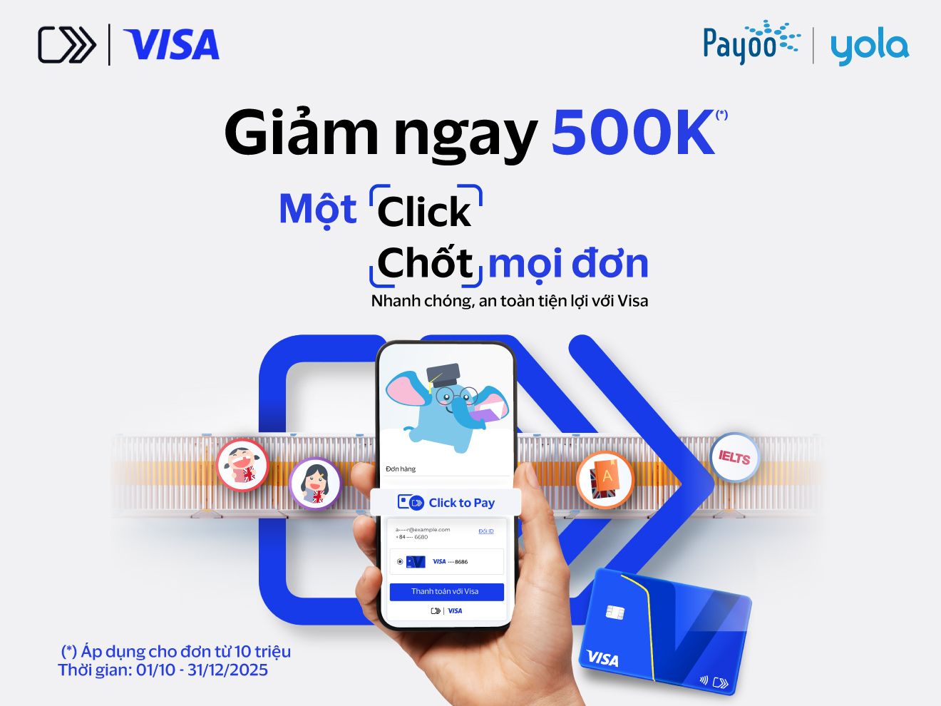 Tin vui cho phụ huynh và học viên tại YOLA: Từ 01/10/2025 đến 31/12/2025, khi đăng ký khóa học và thanh toán bằng phương thức Click to Pay | Visa tại website YOLA, quý phụ huynh và học viên sẽ được giảm ngay 500.000 đồng cho hóa đơn từ 10 triệu đồng.