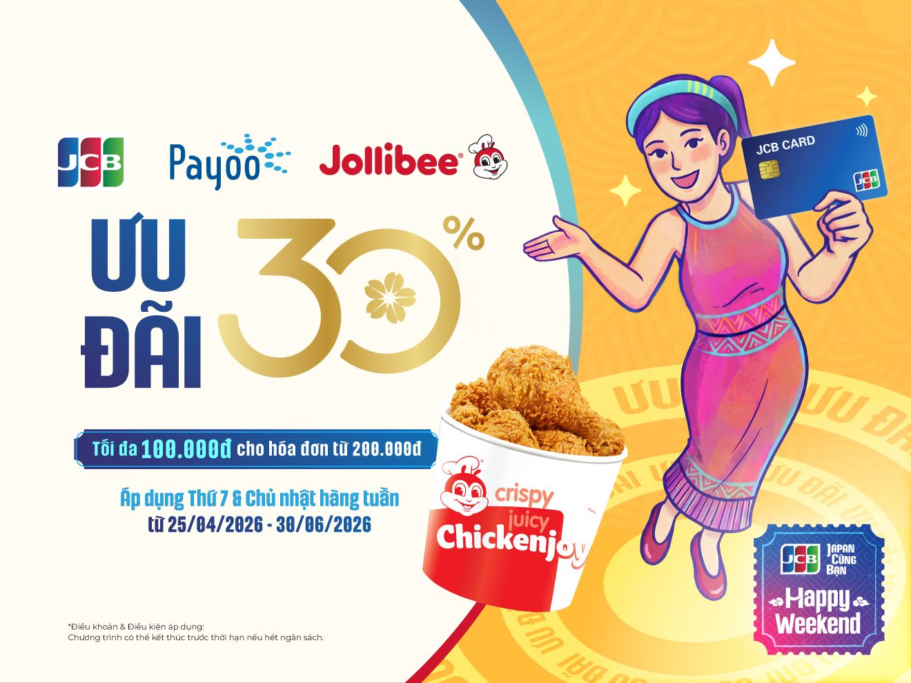 Cuối tuần là thời điểm lý tưởng để tụ họp cùng gia đình, bạn bè và thưởng thức những món ăn yêu thích tại Jollibee. Giờ đây, trải nghiệm đó còn hấp dẫn hơn khi bạn được giảm ngay 30% tối đa 100.000đ cho đơn hàng từ 200.000đ khi thanh toán bằng thẻ JCB.