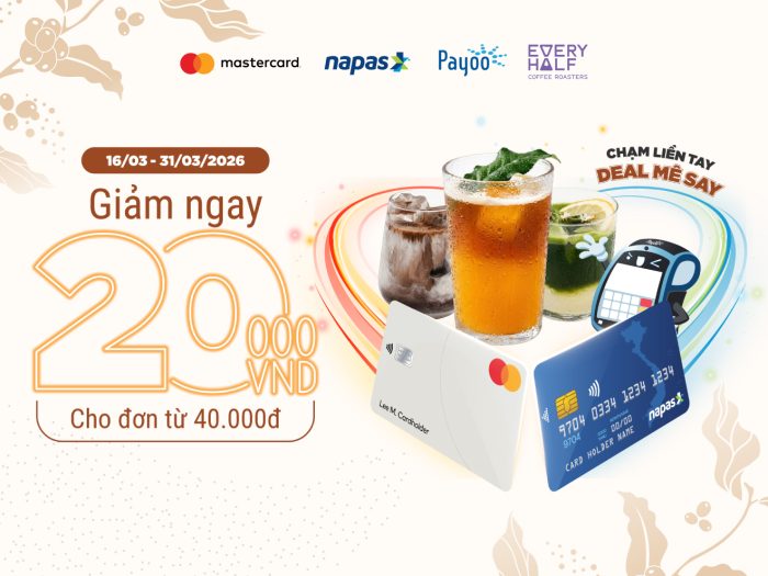 Khách hàng sẽ được giảm ngay 20.000đ cho đơn hàng từ 40.000đ khi chạm để thanh toán bằng thẻ Contactless Mastercard® hoặc Napas trên Payoo POS tại các cửa hàng Every Half Coffee. Chương trình áp dụng từ ngày 16/03/2026 đến hết ngày 31/03/2026, hoặc đến khi hết số lượng ưu đãi.