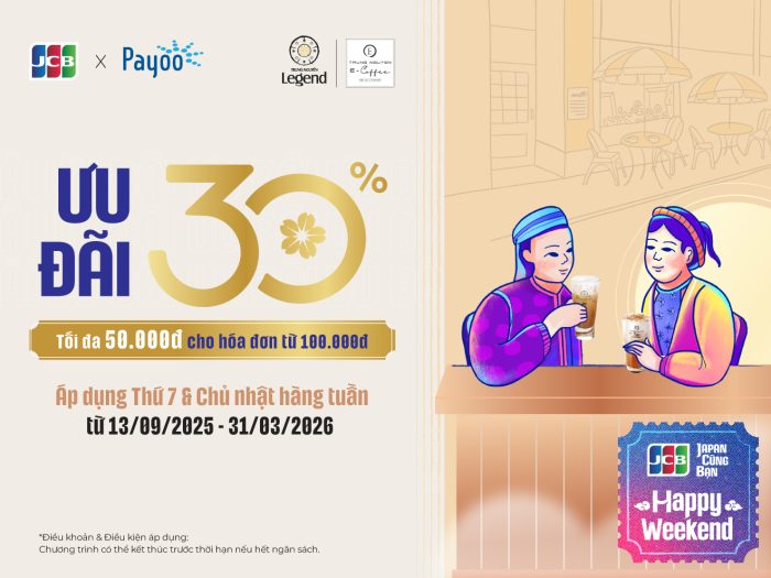 Cuối tuần, bạn thường chọn nơi nào để tìm lại sự cân bằng và tái tạo năng lượng? Hãy ghé Trung Nguyên Legend & Trung Nguyên E-Coffee, nơi hương vị cà phê đậm đà hòa quyện cùng không gian thư thái. Đặc biệt, từ 13/09/2025 đến 31/03/2026, vào mỗi Thứ Bảy và Chủ Nhật hàng tuần, chủ thẻ JCB sẽ được tận hưởng ưu đãi 30% (tối đa 50.000 đồng) cho đơn hàng từ 100.000 đồng khi thanh toán qua Payoo POS.
